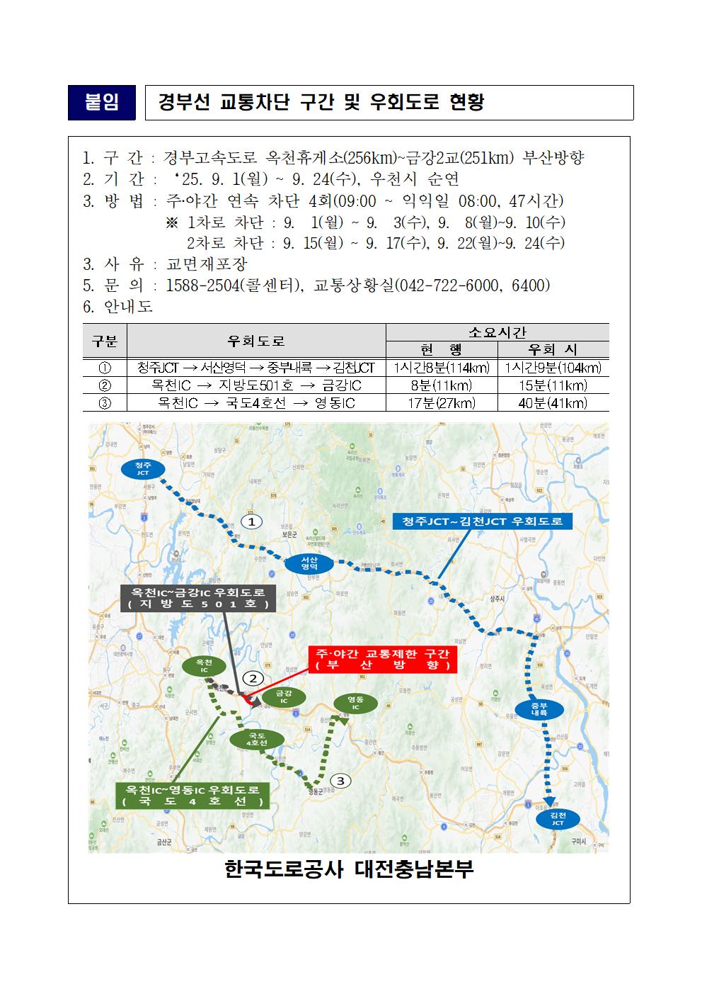경부고속도로 교통차단 구간 및 우회도로 현황
